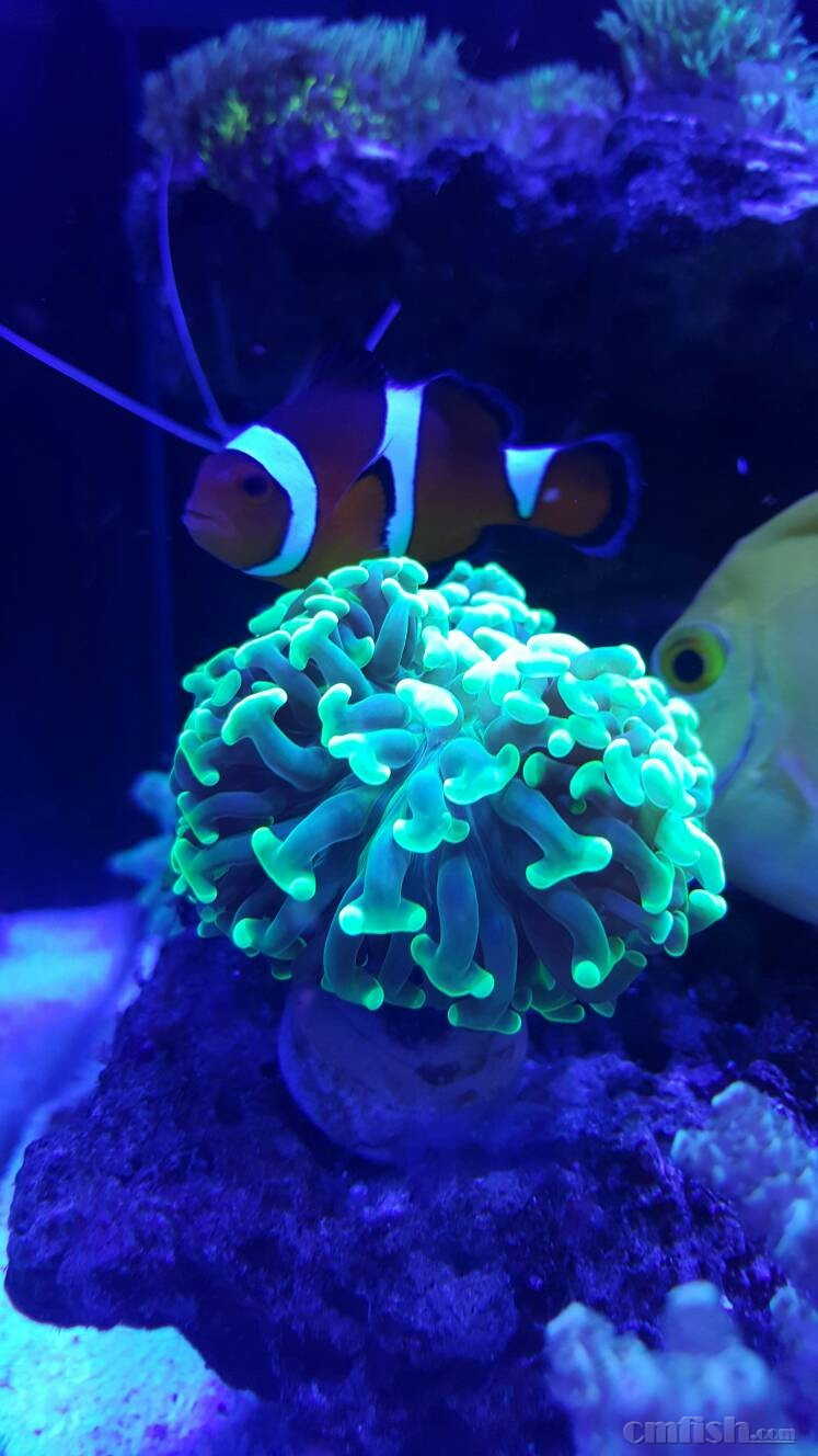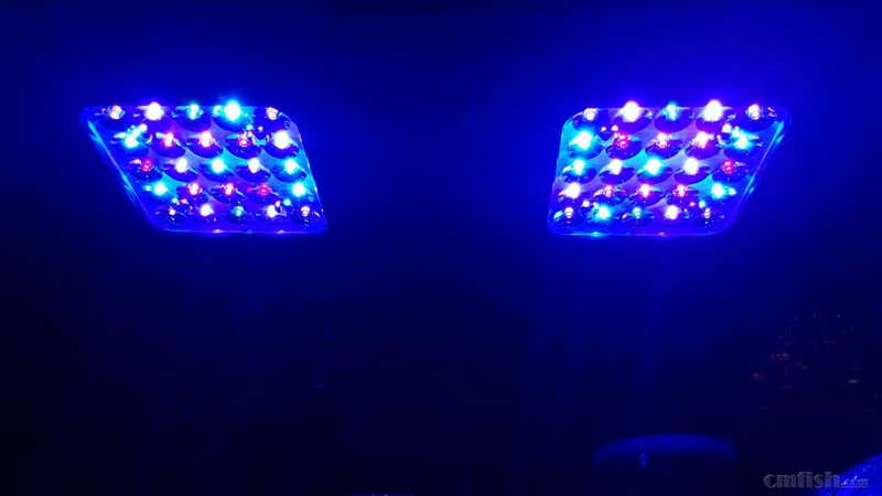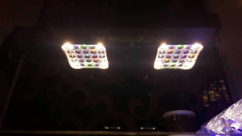 支架安装完毕完毕,连接主灯电源,瞬间眼晕了,才想起来说明书里面说了不要直视灯头正面   !太亮了,满功率亮起,瞬间感觉灯具温度好高啊,128W,看来不是一般的厉害,以前用的是60瓦。看来我不能开的太强了,要不然估计珊瑚能晒糊气了! 幸好儿子不在旁边,要不然又要挨骂了,强光