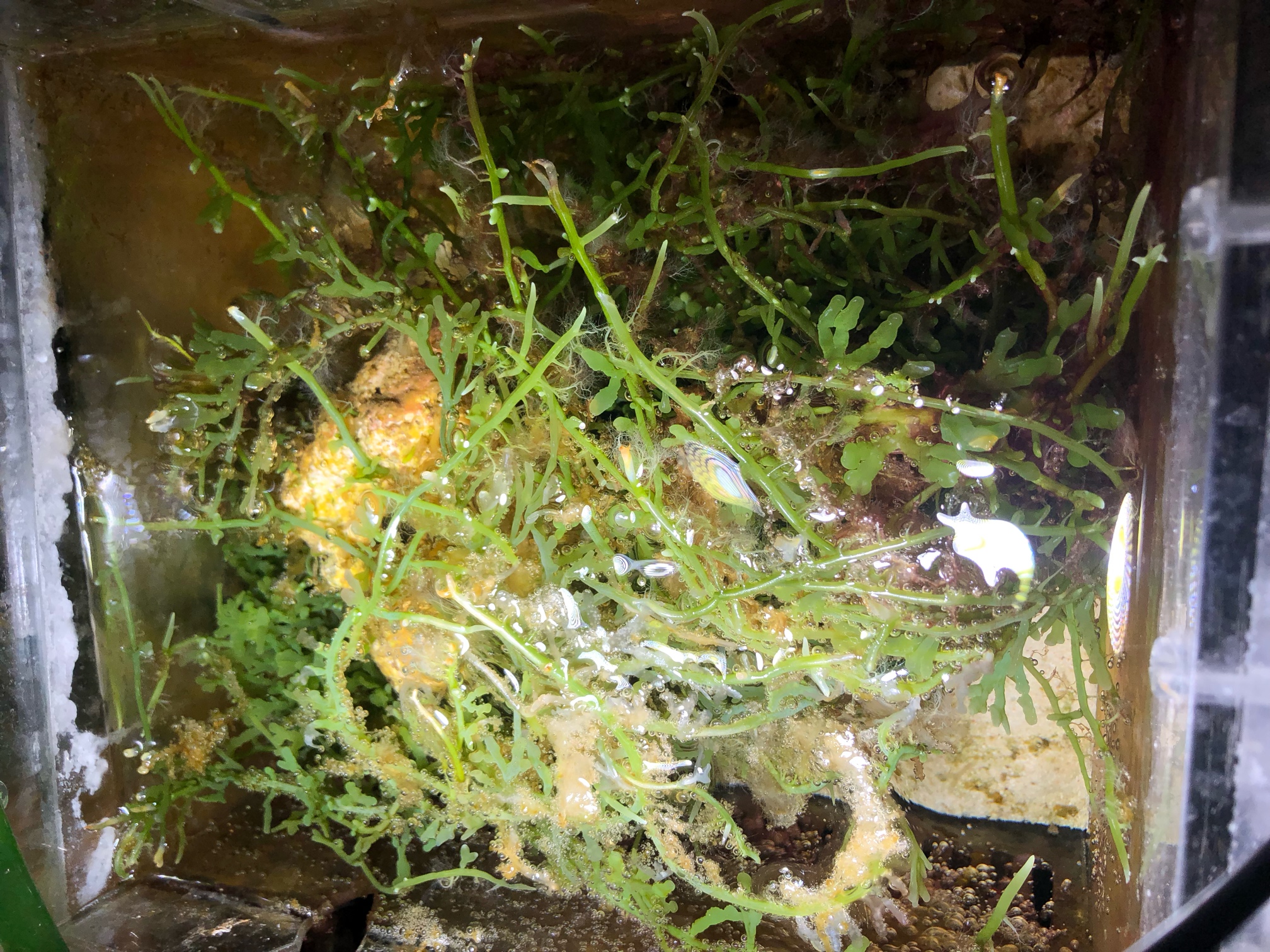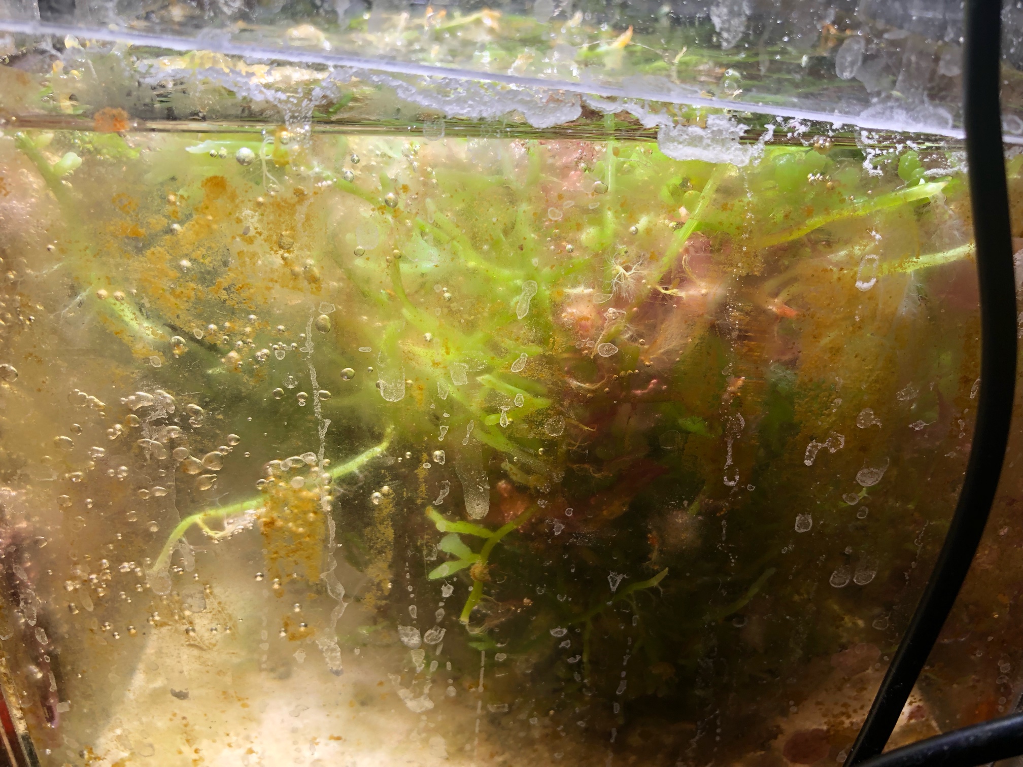 晚上回家化盐关灯以后开始发起总攻,菌膜连沙子一起全部吸走,盆中手动洗沙。换水一桶。换完加了0.05ml全菌。