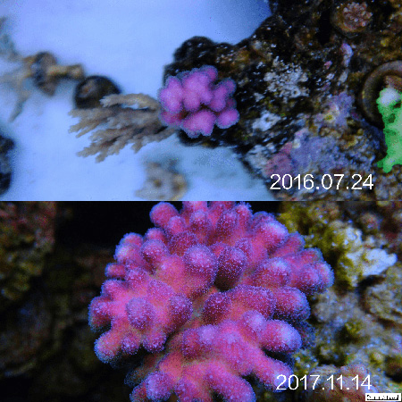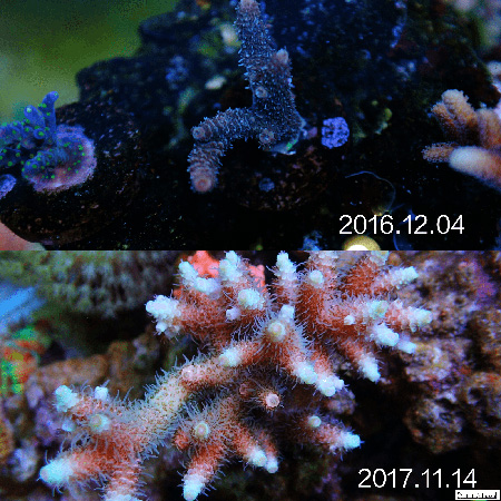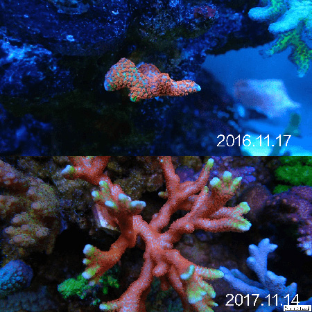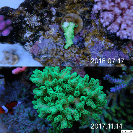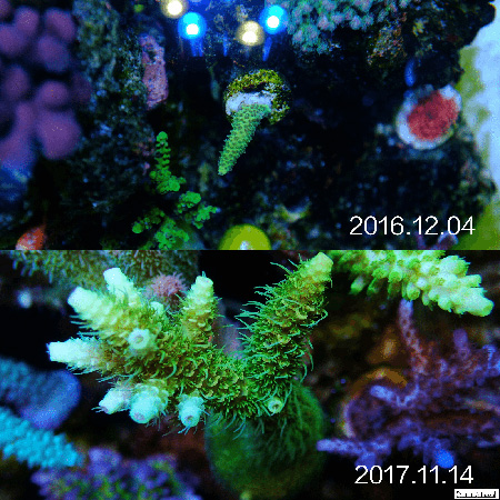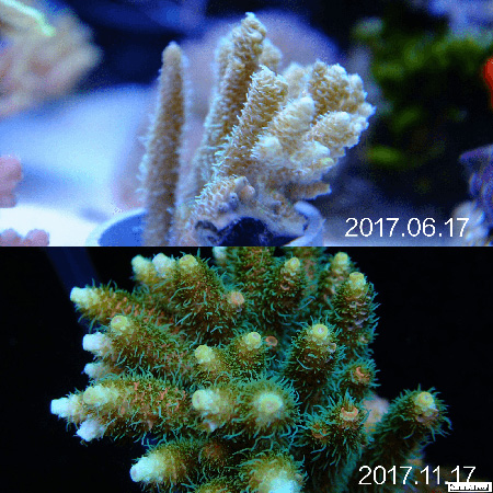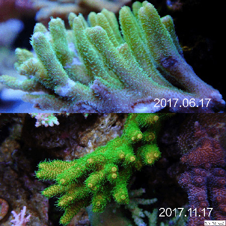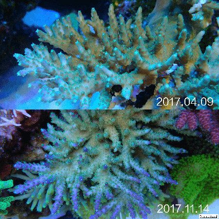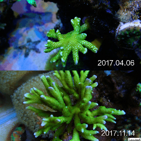 然后根据藻像来控制灯光时间, 比如我觉得NO3低了水瘦了, 那么我就会降低一下T5部分的开灯时间,一般调整在1个小时